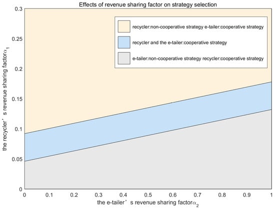 As shown in Figure 6, at least one party will choose the cooperative strategy, regardless of how the revenue-sharing factors of the recycler and the e-tailer are determined, because, unlike the non-cooperative scenario, the cooperative strategy increases the total profit of the supply chain members. Regardless of the strategy of profit distribution between the recycler and the e-tailer, at least one party will see an increase in profit. Any party with increased profit will undoubtedly select the cooperative strategy. The revenue-sharing factors must be set within reasonable ranges, otherwise, either the recycler or the e-tailer will give up cooperation on account of reduced profits. Cooperation between the recycler and the e-tailer may increase the total profit of both parties, but it also changes the original profit distribution mode in the non-cooperative scenario. In the absence of a revenue-sharing contract, i.e., when are both zero, to redistribute the total profit after cooperation, the e-tailer will ultimately withdraw from cooperation because it earns less after spending more on publicity to attract traffic for the recycler. Only reasonable revenue-sharing factors ( within the blue area of Figure 6 can create a win–win outcome by increasing the profits of both parties that choose to cooperate. Compared with the e-tailer, the recycler is the more critical party. Regardless of the e-tailer’s choice of revenue-sharing factor, the establishment of cooperation ultimately depends on the recycler’s revenue-sharing factor. Cooperation can be established only when the recycler sets its revenue-sharing factor within the range of . Notably, when the recycler’s revenue-sharing factor is set within the range of , cooperation can be established with ease, even without the allocation of the e-tailer’s revenue.