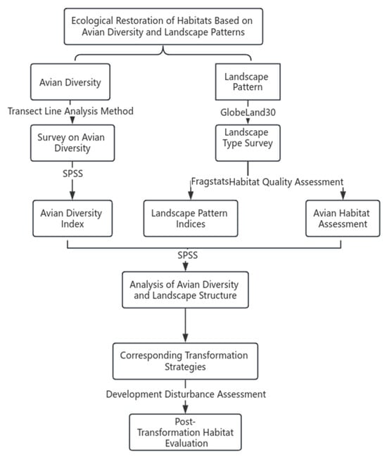 This paper adopts a combined research approach involving avian diversity indices and landscape pattern indices. Firstly, avian diversity was surveyed using fixed-transect lines to obtain information on bird species and quantities in the study area. Subsequently, the SPSS 26.0 software, in conjunction with the Shannon–Wiener index, was employed to calculate the avian diversity index (H), family (F) diversity index, genus (G) diversity index, and G-F index. Secondly, a landscape type survey was conducted utilizing GlobeLand30 and GPS to determine the landscape types of the sites, which were then mapped into CAD drawings. Furthermore, the CAD drawings were imported into GIS for land-use reclassification, resulting in GIS data. The GIS data were then input into Fragstats 4.2 to obtain landscape pattern indices. Finally, based on the landscape types, a habitat assessment for birds was conducted in the pre-transformed study area to determine the necessity of the transformation. After completing these foundational preparations, further steps involved predicting the relationship between avian diversity and landscape structure and assessing whether the transformed quarry park meets the conditions for bird habitat. In studying the relationship between avian diversity and landscape structure, a multiple linear regression model was applied for prediction to discern the inherent connections. For evaluating the habitat conditions of the transformed quarry park, the feasibility of the study was verified through disturbance assessment (Figure 1).