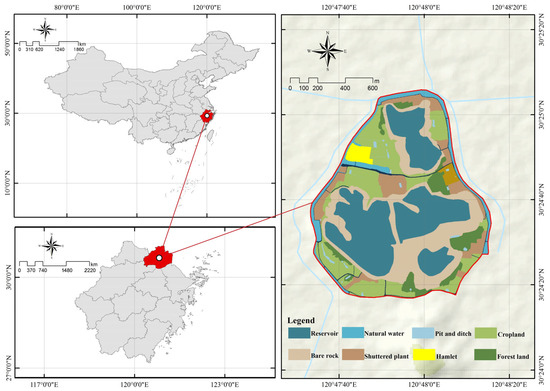 The study area is located in the southeastern part of Haining City, Zhejiang Province, China, in Yuanhua Town (30° N, 120° E) (Figure 2). It comprises three sections: Baojiashan, Shenfunshan, and Dashanwan Village, including four mine pits that have been filled with water to form lakes—East Lake, South Lake, West Lake, and North Lake (tentatively named). The total surveyed area within the research site is 152.1 hectares. The region features a north subtropical maritime humid climate, characterized by mild temperatures and abundant precipitation. During the cold season, prevailing winds come from the north to northwest, resulting in a dry and chilly climate with relatively low precipitation. The area experiences distinct seasons, with longer winters and summers and shorter spring and autumn periods. The surface vegetation cover is sparse, with a tendency for arid and warm conditions, leading to the formation of temporary water bodies like vernal pools. This area serves as an ecotone for various habitats due to its diverse conditions, making it a challenging but potentially rich environment. However, prolonged mineral industry development has led to habitat homogenization, resulting in a decline in bird diversity.