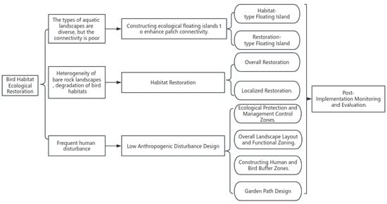 The development of the mining park has impacted the richness of bird diversity. Coordinating the harmonious coexistence of humans and birds is a core issue for the sustainable development of the mining park. This study aims to investigate the relationship between landscape patterns and bird diversity and propose ecological restoration strategies for the mining park. Through field surveys and fixed-transect methods, the existing dominant bird species in the mining park were surveyed. The Shannon index was used to analyze the level of bird diversity in the mining park. A site plan of the mining park was drawn, and ArcGIS 10.8 and Fragstats 4.2 software were used to statistically analyze the landscape patterns of the mining park. The results of the two data sets were compared and analyzed to determine the relationship between landscape patterns and bird diversity. A total of eight landscape types were identified, and diversity indices, including the H (Shannon diversity index), F (species richness index), G (genus richness index), and G-F indices, were calculated. Existing issues in the site include diverse aquatic landscape types but poor connectivity, heterogeneous rocky landscape, bird habitat degradation, and frequent human interference. Proposed solutions include building ecological floating islands (habitat-type floating islands, restoration-type floating islands) to connect patches; comprehensive restoration combining full and partial restoration to restore bird habitats and increase vegetation coverage of rocky patches; low human interference design through ecological protection control zones, landscape functional zones, and park road design to create an environment for bird habitats and a mining park landscape suitable for leisure recreation, creating a new home for cohabitation between humans and birds. The research results indicate that landscape pattern diversity, heterogeneity, fragmentation, and human interference affect the richness of bird diversity. Ecological restoration, plant cultivation, and zoning planning can transform the site, enhance the landscape, and provide theoretical support and practical guidance for the creation of habitats for similar bird species.