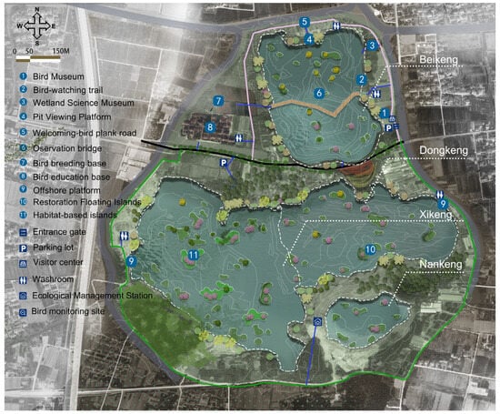 While constructing the mine pit park, simultaneous large-scale development has impacted the ecological chain, disrupting the habitats of birds. The quality of habitats directly influences bird distribution, population density, and reproductive success. Constructing suitable habitats holds significant importance in preserving bird diversity and enhancing the ecological environment in both urban and rural areas [1]. According to the varied habits and environmental requirements of different bird species, bird ecological populations can be categorized into Natatores, Grallatores, Passeres, Scansores, Terrestores, and Raptors [2,3,4,5]. Natatores, adept at swimming, diving, and rapid flight, generally inhabit areas near lakes, with a high demand for aquatic habitat quality. Grallatores, not proficient in swimming, prefer nesting in tall trees near water and forage on shores [6]. Passeres, typically small-sized birds known for their vocalizations, mostly inhabit trees, with a few ground-dwelling species [2,7,8,9]. Scansores are predominantly active in sparse forests, grasslands, and open water and feed on insects in tree canopies, with their hunting influenced by the growth of trees [6,7]. Terrestores, typically active on land, mainly feed on plants, are not adept at flying, and are commonly found in cultivated land and shrubbery and around residential areas [10]. Raptors, primarily consuming birds and mammals, are adapted for capturing and tearing apart their prey, often perching on tree branches [11]. Therefore, the conservation of bird diversity can be achieved by considering their habits and rational planning and utilization of habitat landscape patterns [2].