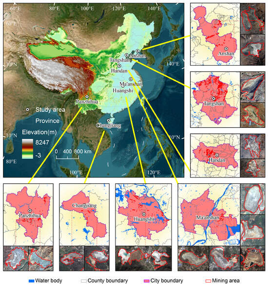 - Dai, X.; Li, W.; Liu, Z.; Tong, C.; Li, C.; Zeng, J.; Ye, Y.; Li, W.; Shan, Y.; Zhou, J.; et al. Effects of Mining on Urban Environmental Change: A Case Study of Panzhihua. Remote Sens. 2022, 14, 6004. [Google Scholar] [CrossRef]