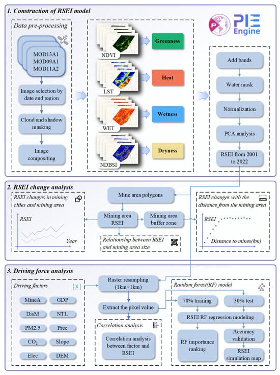 In this study, seven typical mining cities in China were selected as research objects. The PIE-Engine cloud platform was used to rapidly generate remote sensing ecological indices (RSEI) as a way to reflect the spatial and temporal changes in the environmental quality of mining cities. In addition, this study separated the RSEI of mining areas based on mine surface data and compared the differences between the RSEI of mining cities and mining areas. The relationship between the RSEI and the distance and area of mining areas was analyzed. Finally, the connection between each driving factor and RSEI was explored through correlation analysis, and the random forest model was used for RSEI simulation and factor importance analysis. The specific technical process is shown in Figure 2.