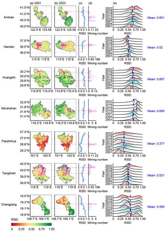 Spatial and temporal changes in RSEI in mining cities, 2001–2022. Note: (a,b) represent the spatial distribution of RSEI in 2001 and 2022, respectively, where greener colors indicate better environmental quality and redder colors indicate worse quality; (c) The line charts reflect the mean RSEI values for each latitude, with the light blue shadow representing the standard deviation of RSEI; (d) The bar chart shows the number of mining areas corresponding to each latitude; (e) The density plots illustrate the pixel distribution of RSEI from 2001 to 2022, with different colors distinguishing the years.