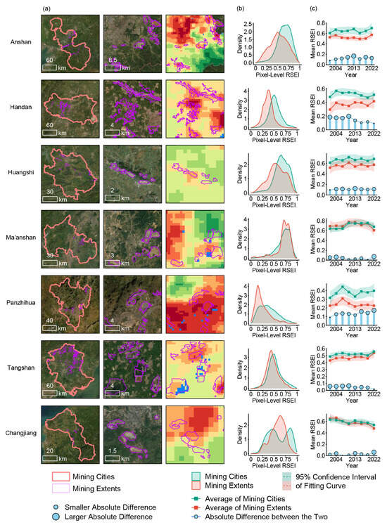 Ecological quality of mining areas in mining cities from 2001 to 2022. Note: From left to right, the figures depict the geographical location of mining areas, (a) magnified image of selected mining areas, and the corresponding distribution of RSEI; (b) The density plot show the distribution of RSEI pixels in mining cities and areas; (c) Green and red colors represent the average RSEI values of mining cities and areas from 2001 to 2022, respectively, while blue represents the absolute difference between the two. The larger the blue dot, the greater the difference in the average RSEI values between the two.