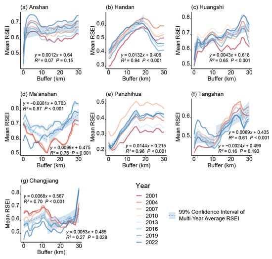 For most of the mining cities studied in this paper, there is a significant process of incremental increase (improvement) in the mean RSEI value as the distance to the mine increases. The speed of the increment is different in different cities, and there are differences in the critical distance at which the increment stops or stabilizes and decreases. Anshan has the most significant incremental trend of RSEI mean, reaching the peak of RSEI at a buffer distance of 4 km from the mine, after which it declines slightly and then fluctuates upward. In Handan, the RSEI increases with distance to the mine and reaches its maximum value at 18 km. In Huangshi City, the RSEI shows a fluctuating upward trend with the increase of distance to the mine, and reaches the peak at 27 km, at which time the mean value of RSEI is 0.774. In Ma’anshan City, the RSEI shows a decreasing and then increasing trend with the increase of distance, with a trough at 13 km, and after that, the RSEI rises rapidly. Panzhihua City RSEI has been in an increasing trend in the first 15 km, after which the RSEI bands around 0.41. Tangshan City overall decreases first and then rises, and the 11 km distance to the mine is the transition point of decline to rise. Changjiang Lizu Autonomous County is in a wave upward trend in the first 11 km.