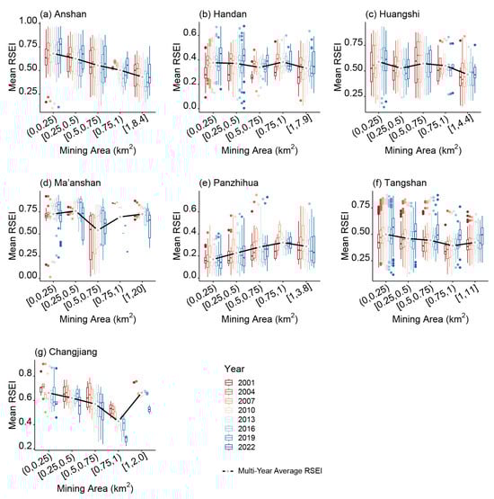 The area of each mining area was calculated in ArcGIS, and the RSEI mean value of each mining area was extracted for analysis (Figure 6). Mining areas were divided into different area intervals for statistical purposes: <0.25 km2, 0.25~0.5 km2, 0.5~0.75 km2, 0.75~1 km2, and ≧1 km2. The RSEI values of the mining areas in Anshan City were negatively correlated with the area of the mines, and the trend was the most significant among the seven mining cities. The mean value of RSEI was as high as 0.681 for mine areas smaller than 0.25 km², and decreased to 0.432 for mine areas larger than 1 km². The RSEI values of Huangshi and Tangshan also showed a decreasing trend with the increase of the mine area, although the trend was more moderate. The relationship between the RSEI value and the mine area in Handan is not obvious, and the mean value fluctuates between 0.332 and 0.382. The RSEI of Ma’anshan City and Changjiang Lizu Autonomous County showed a decreasing and then increasing trend with increasing mine area, with Ma’anshan City having the lowest RSEI, in the interval of 0.5 to 0.75 km², and Changjiang Lizu Autonomous County having the lowest RSEI, in the interval of 0.75 to 1 km². Unlike other cities, the RSEI of mining areas in Panzhihua City first increased and then decreased with the increase in area.