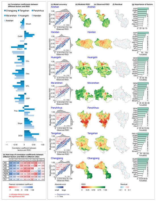Correlation of drivers with RSEI and random forest regression results. Note: DEM, Slope, Prec, GDP, NTL, Elec, CO2, PM2.5, DisM, and MineA are elevation, slope, annual precipitation, GDP, nighttime light intensity, electricity consumption, CO2 emissions, PM2.5 content, distance to the mine, and percentage of the mine area within 100 km2. In reference to (b), AS: Anshan, HD: Handan, HS: Huangshi, MAS: Ma’anshan, PZH: Panzhihua, TS: Tangshan, and CJ: Changjiang.