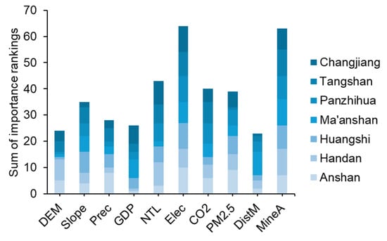 There is significant spatial heterogeneity in the ecological quality of the region []. To explain this situation, it is crucial to identify its key driving factors and clarify the interactions between these factors and the environment. It is also key to developing and implementing ecological policies for targeted mining cities. In this study, during the construction of the random forest model, the RSEI value of each pixel in the study area and its corresponding driving factor value were extracted. Of the pixels, 70% were used for random forest model construction, and 30% for model validation []. The importance of a factor was assessed by calculating the degree of decrease in the average accuracy of the model (% IncMSER). The greater the decrease in accuracy, the greater the importance of the factor in explaining the RSEI []. Finally, by ranking the % IncMSER values of the factors from highest to lowest (Figure 7g), the importance of each factor to the ecological quality of mining cities can be clarified, with larger values indicating higher importance of the factor. Further, this study obtained a comprehensive ranking of the importance of the factors by ranking the importance of each factor in different cities (Figure 7g) and calculating the comprehensive ranking (Figure 8). The smaller the value of the overall ranking (the shorter the bar), the higher the combined importance of the factors across the cities. Combining the data from the seven mining cities, the order of importance is distance to mine > DEM > GDP > Precipitation > Slope > PM2.5 concentration > CO2 emissions > Nighttime light intensity > Percentage of mine area > Electricity consumption.
