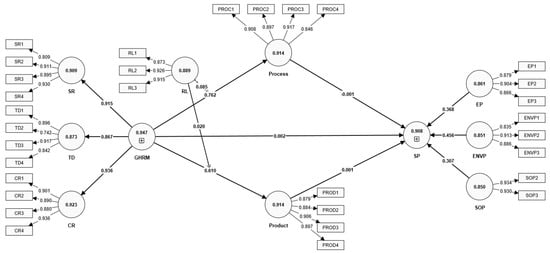 In this study of GHRM, green innovation, and sustainable performance among Malaysian SMEs, the measurement model’s reliability and validity were rigorously evaluated (see Table 2 and Figure 2). The reliability of the constructs was established through Cronbach’s alpha, with values ranging from 0.850 to 0.923, indicating high internal consistency [82]. Composite reliability scores were also robust, ranging from 0.913 to 0.946, further affirming the consistency of the constructs [83].