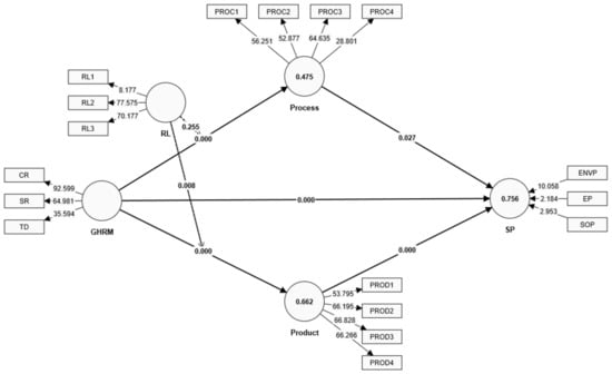 In examining the structural model, path coefficients indicated a significant relationship between GHRM practices and sustainable performance. Bootstrap resampling with 5000 subsamples validated these paths, showing p-values below 0.05, thus confirming the hypothesized relationships. The R-squared value for sustainable performance was substantial, demonstrating the model’s strong explanatory power. Additionally, model fit indices, including SRMR and NFI, fell within acceptable ranges, indicating an adequate fit of the model to the empirical data [84].