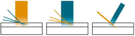 From Equation (2), it is immediate that we can change the path length of the radiation inside the topmost layer of the sample just by changing the angle of irradiation or detection. For shallow angles of irradiation, most of the photons will be absorbed on the surface of the sample; thus, we will have a higher surface sensitivity. Similarly, for shallow angles of detection, most of the fluorescence photons emitted from the bulk will be highly attenuated before reaching the detector, and only those coming from the surface will be detected. More concisely, we can reduce the penetration depth and the escape depth of the photons, lowering the angles of irradiation and detection.