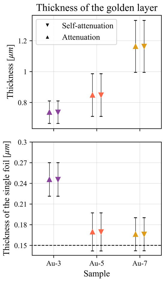 In our first experiment [77], we tested if AR-XRF could be employed for samples that present lateral inhomogeneities, as this is one of the main differences between samples in the cultural heritage and samples in the field of material science. For this reason, we prepared gilded metal samples using a copper sheet and covered them with a sequence of golden leaves. The golden foils, made of 18 kt gold (75% gold and 25% silver alloy), have been stacked and glued using an organic glue. Their mean thickness is 0.15 µm, and we prepared specimens with three, five, and seven golden foils. The samples have been analyzed at the Nuclear Science Instrumentation Laboratories (NSIL) of the International Atomic Energy Agency (IAEA) [78]. The spectrometer was equipped with a Mo source, collimated with capillaries. The sample was placed on a sample holder that allows for a rotation, and the SDD detector, placed at 90° with respect to the source, was collimated with a metallic slit with an opening of 60 µm, resulting in an angular resolution of nearly 5.5 mrad. For each sample, three spots have been measured, rotating the sample from 0° to 30° with respect to the detector. The AR-XRF spectra of copper and gold were then compared with theoretical AR-XRF profiles, calculated for different thicknesses of the gold layer. The signal of copper, which is the bulk layer, is affected by the attenuation of the layer of gold; thus, the thicker the layer of gold, the higher its attenuation; the signal of gold, instead, is affected only by the layer self-attenuation and increases as the gold layer thickens. In Figure 5 (taken from [77]), the calculated thicknesses of the golden layers are plotted on top, on the bottom instead of the thickness of the single leaf, compared with its nominal value. The thickness calculated using both the signal of copper (upward triangles) and gold (downward triangles) agrees with the theoretical thickness, especially for the samples with five and seven golden leaves, while in the sample with only three foils, there is an overestimation, probably due to the leaves deposition that has caused the formation of folds where the layer is thicker.