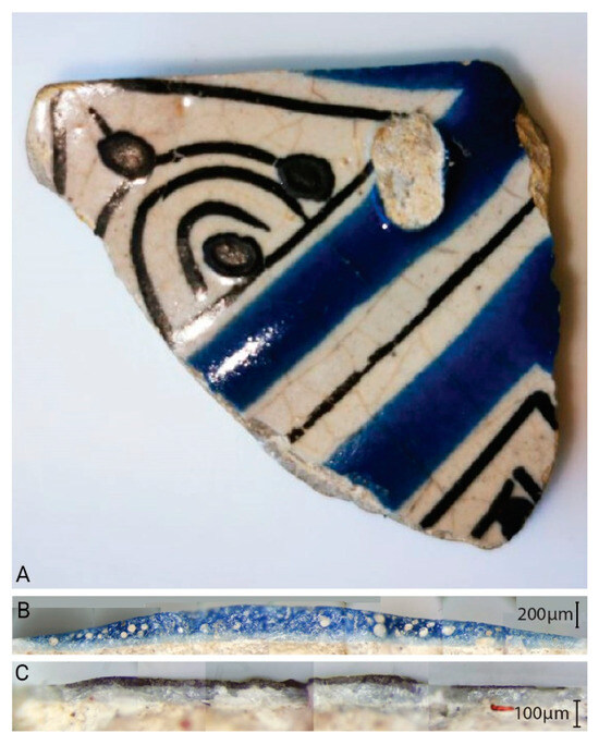 Puebla ceramic sample, picture from [79]. Over the white glaze, there are blue and black decorations. Picture (A) front view of the shard, picture (B,C) lateral profiles of the shard, the thickness of the black and blue decorations can be appreciated.