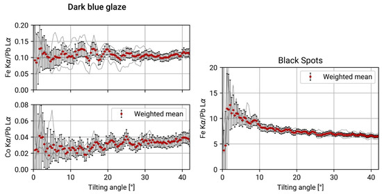 The ratio of the chromophore over the lead, Figure 8 (from [79]), then showed that we could not penetrate inside the white glaze for the blue decorations (the ratio was linear over the angular scan, Figure 8 on the left), while we could enter the white glaze in the case of the black decorations (the ratio was not linear, indicating a loss in concentration of the chromophore as we penetrate, Figure 8 on the right). For this reason, we observed that the blue glaze was either too thick or had diffused inside the white glaze, making it impossible to distinguish them.