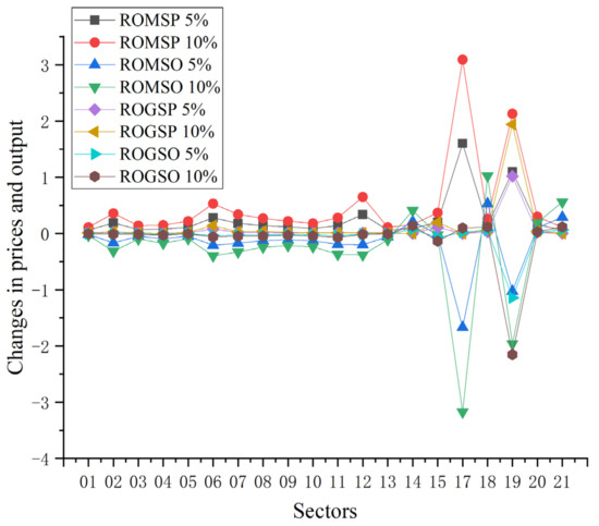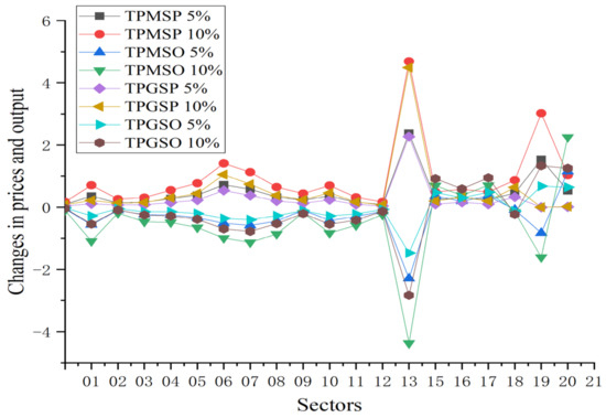 Figure 2 demonstrates that government regulation of electricity prices disrupts the normal price transmission within the coal-electricity supply chain, lessening the impact of coal price fluctuations on downstream industries. As a result, compared to a market-driven approach to thermal power pricing, the decrease in industrial sector prices is less significant. Industries such as chemicals, coking, and non-metallic mineral products, which have high electricity and direct coal demands, experience a minor impact on their prices due to regulated thermal power prices. For example, a 5% increase in coal prices results in price rises of 2.29%, 0.10%, 0.55%, 0.38%, and 0.23% in these sectors, respectively. Government intervention in electricity pricing also reduces the substitution effect between different energy sources, leading to a smaller increase in petroleum and natural gas prices under this regime. Furthermore, the output across various sectors declines less under government-regulated thermal power prices than in a market-based scenario. Specifically, the coking, chemical, and metal smelting industries see notable output declines, while sectors like mining, textiles, and machinery equipment manufacturing are more resilient to government price controls. By lowering energy input costs for companies, government regulation helps mitigate the reduction in sector outputs compared to market-driven thermal power prices.