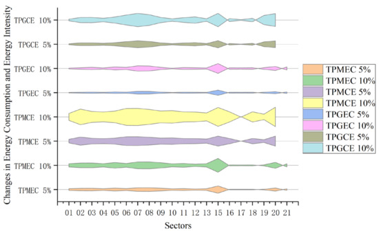 Figure 3 shows that under the market mechanism of thermal power prices, increasing coal prices leads to a significant decrease in energy consumption in high-energy-consuming industrial sectors. For instance, with a 5% increase in coal prices, the coking industry’s energy demand decreases by 3.07%, while thermal power decreases by 1.29%, and non-metallic mineral products and metal smelting industries decrease by around 1.52%, with other industrial sectors also experiencing noticeable declines. Although petroleum processing increases its energy consumption due to substitution effects, the increase is not significant, indicating that the rise in coal prices plays a vital role in curbing China’s energy consumption. However, government regulation of electricity prices weakens the effect of coal price increases in suppressing energy consumption, except for some industries directly downstream of coal, such as coking, chemical, and metal smelting industries, which experience relatively smaller decreases. The energy consumption of other industrial sectors decreases by more than 50% compared to the situation under the market mechanism of thermal power prices, as electricity appears cheaper and enterprises have less incentive to advance technology, resulting in a smaller decrease in energy intensity. Although regulating electricity prices ensures economic growth, it has negative impacts on reducing carbon emissions and improving energy efficiency.