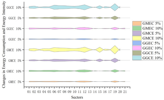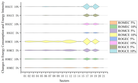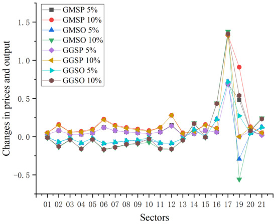 Table 5 reveals that a surge in refined oil prices results in a downturn in output across various industrial sectors, subsequently reducing refined oil consumption. This trend is notably pronounced in sectors like transportation, the chemical industry, and construction, which significantly cut back on their energy use. Specifically, a 5% hike in refined oil prices triggers a decrease in energy demand by 2.47%, 1.29%, and 2.09% in these sectors, respectively. As China’s agriculture sector continues to mechanize and the usage of chemical fertilizers escalates, the impact of rising refined oil prices on this sector is considerable, leading to a marked drop in energy demand. Increases of 5% and 10% in refined oil prices correspond to reductions of 1.43% and 2.76% in energy demand within the agriculture, forestry, animal husbandry, and fishery sectors. Other industrial sectors also report varied levels of energy input declines due to the uptick in refined oil prices. Similarly, climbing gas prices curtail energy inputs across different industrial sectors, albeit with a lesser impact compared to refined oil. The effect is primarily observed in sectors with high gas consumption, such as the chemical industry, other mining industries, and the coking industry, where a 5% rise in gas prices leads to energy demand decreases of 0.08%, 0.11%, and 0.08%, respectively. Given that gas is a critical utility for daily life, its price increase exerts a significant influence on energy demand in the service industry, with a 5% increase in gas prices causing a 0.09% reduction in energy demand, a more substantial decline than seen in some industrial sectors.