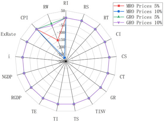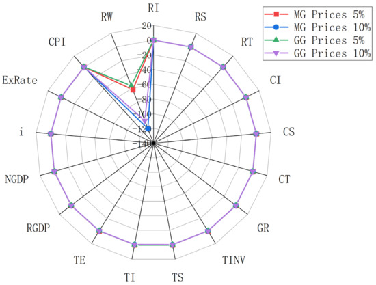Figure 7 reveals that, similar to coal, a surge in crude oil prices negatively affects the income of households, businesses, and the government within the industrial chain, albeit to a lesser extent than coal. A 5% increase in crude oil prices under the market dynamics of refined oil prices results in marginal income reductions of 0.0006% for households, 0.06% for businesses, and 0.05% for the government. This price hike also impacts other macroeconomic indicators, leading to a 0.12% and 0.03% drop in real and nominal GDP, respectively, a 0.06% decrease in interest rates, and a 0.16% increase in exchange rates. Consequently, resident welfare declines by 144.66 due to the combined effect of rising price indexes and falling incomes. However, Figure 7 also illustrates that government regulation of refined oil prices significantly mitigates the economic downturn caused by rising crude oil prices. The effects on imports, exports, and real GDP are particularly softened, with a 5% increase in crude oil prices causing just a 0.0023% and 0.0016% decrease in imports and exports, respectively. Notably, government intervention reduces the decline in real GDP by 80% compared to the market-driven scenario, highlighting the importance of price controls in sustaining economic growth. Furthermore, the impact on resident welfare is considerably less severe under government regulation, with a 5% and 10% increase in crude oil prices resulting in welfare reductions of only 21.47 and 35.49, respectively.