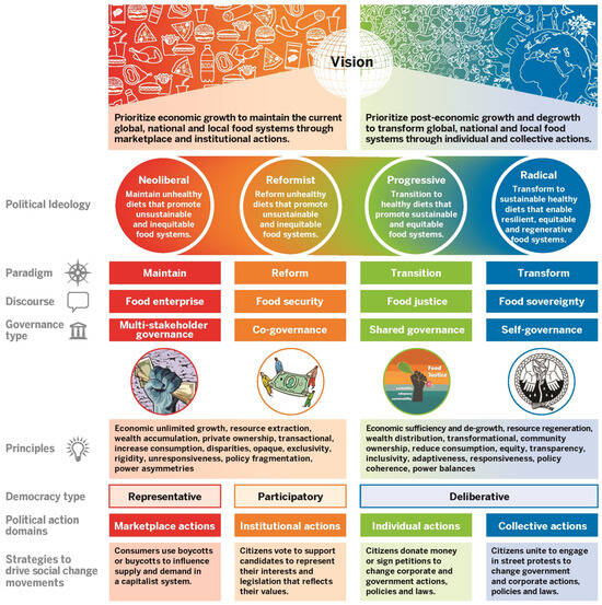 The progressive political ideology aims to transition toward healthy, sustainable diets and regenerative food systems for people, ecosystems, and planetary health. A radical political ideology fosters an alternative agroecological paradigm to transform food systems to be healthy, equitable, resilient, and regenerative for people and animals to support ecosystems and planetary health. These latter two approaches are supported by the principles of economic sufficiency and degrowth, resource regeneration, reduced consumption, wealth distribution, community ownership, equity, transparency, inclusivity, adaptiveness, and responsiveness [29].