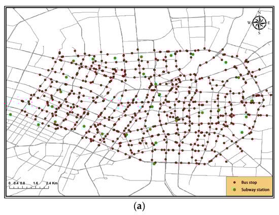 Based on the vector latitude and longitude data of subway and bus stations provided by Taile Map, this study constructed the subway and bus network of Shenyang. At the same time, we identified all the bus lines and subway lines within the Shenyang 1st Ring Road according to Baidu Map. By identifying the bus lines and subway lines passing through each station, and based on the departure frequency of each line provided by Baidu map, we calculated the number of trains passing through the station and marked Pi, where i is the line number passing through the station (e.g., if the departure interval of link No.1 was 9 min, then P1 = 6.667 train trips/h). Then, the total number of trains passing through the station during the 3 h morning peak is Pt = 3 × . If the rated carrying capacity of the bus is marked as Cb, the total carrying capacity is marked as Cbt, the rated carrying capacity of the subway is marked as Cs, and the total carrying capacity is marked as Cst, then the total carrying capacity during the morning peak period is Cbt = Pt × Cb, Cst = Pt × Cs. Similarly, we can calculate the total carrying capacity of buses and subways during the evening peak.