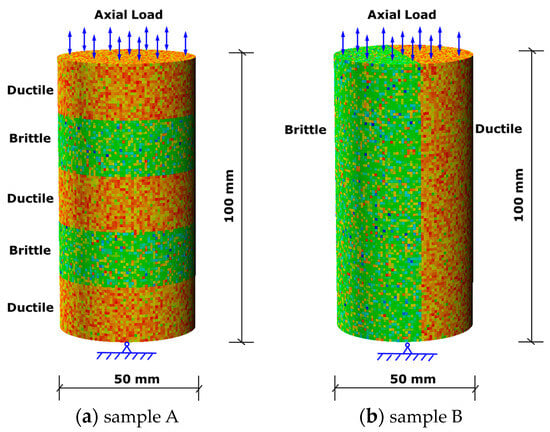 Two numerical rock samples (diameter: 50 mm; height: 100 mm) are established for uniaxial compressive and tensile tests, as shown in Figure 2. Each sample is discretized into 480,000 finite elements. Sample A contains five layers of identical size. The layers are interbedded with two kinds of rock materials with different levels of brittleness. One material represents a brittle rock and the other represents a relatively ductile rock. Sample B contains two axial halves and each half represents a brittle or ductile material, as in sample A. Both two samples are fixed on the bottom and loaded on the top with axial displacement −5 × 10−3 mm/step in uniaxial compressive tests and 1 × 10−3 mm/step in uniaxial tensile tests. Numerical calculation will be performed until rock failures crush down the samples. Since each test involves a sample containing rock materials with different levels of brittleness, contrastive analyses will be conducted based on the rock failure characteristics from the simulation results.