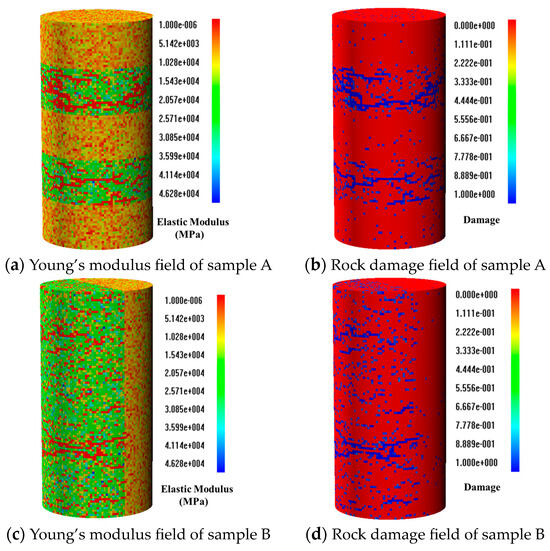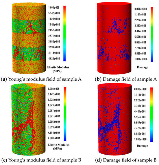 Numerical results of uniaxial compressive tests on samples A and B: (a,c) show the Young’s modulus fields; (b,d) show the rock damage fields.