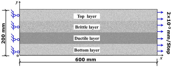 Due to relatively low strength and high conductivity, natural fractures, including natural fissures and large fractures such as faults, could bring different levels of reduction to the aquiclude zone thickness h2 during mining activities, and even directly lead to water inrush disasters in some cases. To tentatively explore the development of natural fractures in floor layers under geological stress, the fracture development characteristics in layered rock with different levels of brittleness should be investigated in advance. A two-dimensional numerical model is established here, as shown in Figure 5. The model is 600 mm in the x-direction and 200 mm in the y-direction, containing four layers of identical size. A brittle layer composed of brittle material and a ductile layer composed of ductile material are sandwiched between the top layer and the bottom layer. The mechanical parameters of the materials in each layer are listed in Table 1. The left boundary of the model is fixed in the x-direction. The right boundary is applied with constant displacement 2 × 10−3 mm/step in the x-direction to create a tensile load on the model. It is important to state that although this model is not exact enough to reflect the long-term action of quasi-static or dynamic geological loads, it is also meaningful to conduct such a simple simulation to explore the basic differences between brittle and ductile rock damage in layered rock.