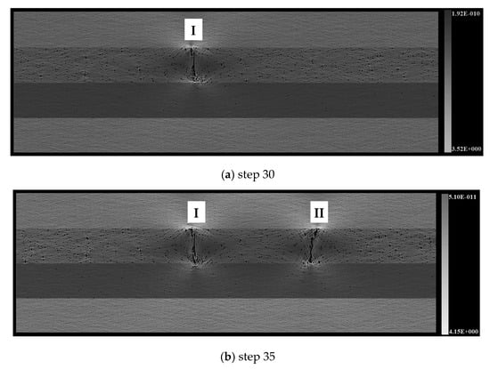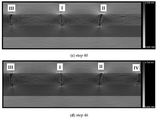 Rock damage is shown from the evolution of the model’s minimum principal stress field in Figure 6. The model stress field is displayed in different loading steps, in which a series of fractures, depicted in pure black, initiate and propagate. As shown in Figure 6a, during loading step 30, a vertical fracture (No. I) forms in the brittle layer. At this time, fracture I is exactly sandwiched between the top layer and the ductile layer. As the loading continues, the second fracture (No. II) forms in step 35 on the right of fracture I, as shown in Figure 6b. It is worth noting that fracture II also initiates in the brittle layer. Afterwards, fracture III forms and then fracture IV forms, as shown in Figure 6c,d. Both of these two fractures initiate in the brittle layer.