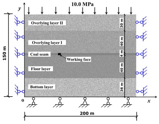 To investigate the damage zone of floor with different levels of brittleness during mining disturbances, a numerical model measuring 200 m in the x-direction and 150 m in y-direction is established as shown in Figure 7. This model consists of five rock layers, in which a working face is preset in the coal seam to simulate the mining activities. This model is constrained on the left and right side in the horizontal direction (x-direction), and is under 10 MPa pressure in the vertical direction to simulate the overburden pressure. The working face keeps moving forward in the x-direction at 5 m/step until excavating 80 m. All of the rock mechanical parameters for this model are listed in Table 2. Similarly, for comparison, two numerical cases are established based on the difference in floor layer brittleness.