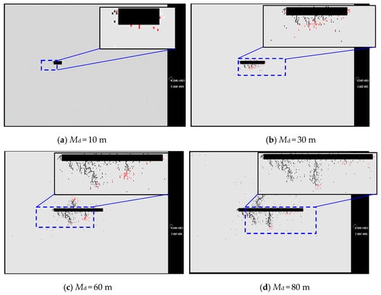 In the case of the brittle floor, the evolution of the model’s AE fields is shown in Figure 8. AE events are the emission of the elastic wave generated in rock-like materials during loading, which originates from the damage of microstructures. AE events provide instant damage information and they can be treated as real-time indicators of the progressive failure of rock. In RFPA, when damage is applied to the overstressed elements, it can bring about reductions in element stiffness and strength, as well as an increase in permeability. Microcracks are considered to consist of totally damaged elements and macrocracks can form where they propagate and coalesce. Therefore, AE fields can be used in this study to describe the floor damage zone and help to quantify the floor damage depth h1. It is noted that model AE events can be found in Figure 8 in red, white, or black. The red represents the areas damaged due to tensile stress in the current step, the white represents those damaged due to shear stress in the current step, and the black represents all of those damaged in previous steps. The mining distance Md (10 m, 30 m, 60 m, 80 m) represents the advance of the working face.