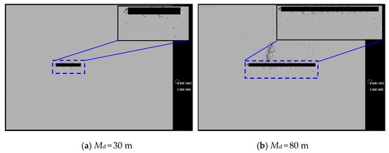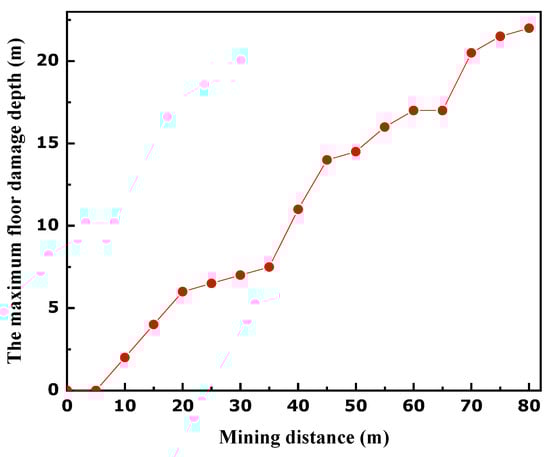 Figure 8a provides the AE field of the brittle case when the mining distance (Md) is 10 m, with a detailed view concerning the coal floor attached. In this step, sparse AE events appear in the floor, which indicates the floor damage zone coming into being. As the working face moves forward, more AE events are discovered in the floor when the mining distance (Md) reaches 30 m, as shown in Figure 8b. In this step, the maximum floor damage depth that the AE field exhibits grows to 7.0 m. It is worth noting that the newly formed AE events in the floor are mostly in red, which demonstrates that rock failure in the floor under mining disturbance is due to tensile damage. As the working face continues to move forward at a mining distance of 60 m, the floor damage zone expands both in length and depth, as shown in Figure 8c. In this step, the maximum floor damage depth increases to 17.0 m and is located 20 m in front of the cut in the horizontal direction. When the working face finally moves forward at a mining distance of 80 m, as shown in Figure 8d, the floor damage zone continues to expand and the maximum floor damage depth increases to 22.0 m. Figure 9 depicts the maximum floor damage depth at different mining distances in all loading steps. It clearly shows the positive variation in the maximum floor damage depth along with the mining distance. However, it is important to state that the location in which the deepest rock damage appears is not constant. It varies as the working face moves. In this case, the final deepest floor damage appears 40 m in front of the cut, as shown in Figure 8d, which is twice the distance of that when the mining distance is 60 m. Moreover, this simulation indicates that during most of the mining process, the floor damage depth along the moving direction of the working face is not consistent. The deepest site where the rock damage appears at present means the floor aquiclude zone here is the weakest and is the site most likely to connect to the upward flow of water and contribute to the formation of a water inrush pathway.