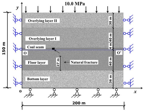Further investigation on the risk of water inrushes from floors with levels of brittleness under mining will be conducted based on the numerical model shown in Figure 11, which comes from the model shown in Figure 7, with the bottom stratum acting as a confined aquifer of 3.0 MPa pressure. A sharply dipping natural fracture develops in the aquifer and extends 27 m upward into the floor strata. O–O’ in the figure is a horizontal dashed line exactly cutting through the uppermost floor elements that are used to monitor the flow rate data in the loading steps. Similarly, two numerical cases are set based on the difference in floor brittleness. All of the mechanical parameters of the rock material in this model are also listed in Table 2.