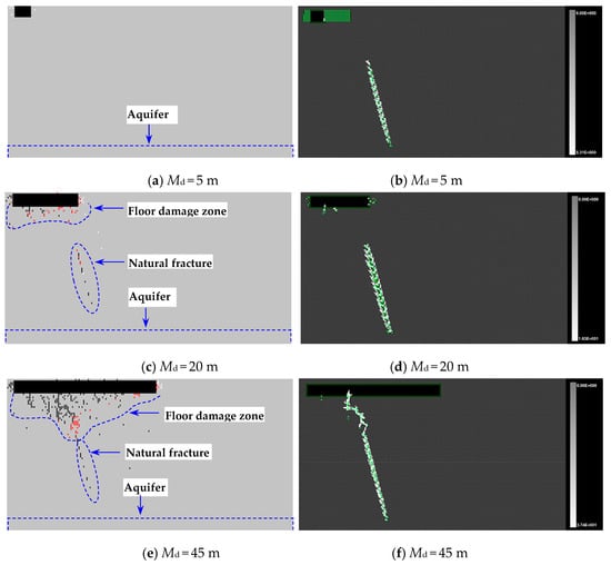 As the working face moves toward the mining distance of 20 m, the AE field in Figure 12c shows that the floor damage zone has already formed. At this moment, element damage of the natural fracture has occurred and this leads to the enlargement of fracture permeability, directly resulting in the enhancement of the maximum flow rate from 5.31 m3/min in the initial step to 16.3 m3/min in the current step. The floor protective zone thickness h2 is greatly reduced at present due to the combined action of the mining activities from the top and natural fracture from the bottom.