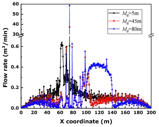 The flow rates of elements along O–O’ are illustrated in Figure 13. Three moments are selected to show the data: (1) at the initial excavation step (Md = 5 m); (2) at the time when the water inrush pathway forms (Md = 45 m); (3) at the final excavation step (Md = 80 m). At the initial excavation step, the maximum flow rate of the upper floor occurs near the mine stope with a value of 0.64 m3/min, and it decreases as the distance from the mine stope to the side decreases.