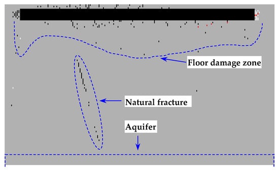In contrast, the AE field in the case of the ductile floor at the mining distance (Md) of 80 m is shown in Figure 14. Obviously, the floor damage zone here is not deep enough to connect the natural fracture to create a water inrush pathway. Therefore, water inrush has not occurred in the case with the ductile floor throughout the whole mining process. It can be easily found that a brittle floor is preferable to increase the risk of water inrushes from underlying aquifers in comparison with a ductile floor.