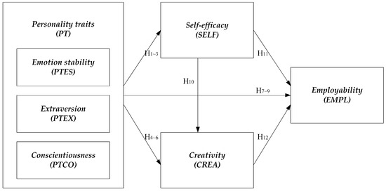 The study establishes the evaluation framework using an expert review and a literature review. The evaluation framework consists of four aspects (personality, PT; self-efficacy, SELF; creativity, CREA; and employability, EMPL), and PT (personality) includes three criteria (emotion stability, PTES; extraversion, PTEX; and conscientiousness, PTCO). Furthermore, there are 12 hypotheses, as shown in Figure 2 and Table 1.