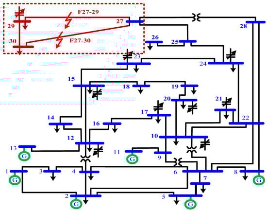 In this study, two severe N-1 faulty conditions were applied to the IEEE 30-bus power distribution system separately, as shown in Figure 1. The two severe N-1 faulty lines under study are F27-29 and F27-30, as illustrated in Figure 1. Fx-y means that the line between bus x and y is out of service, and so on. Table 1 provides a summary of the data for the IEEE-30 bus power distribution network utilized in this study.