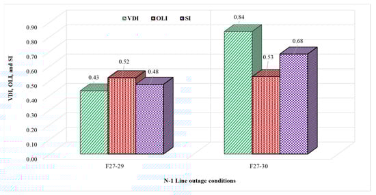 Table 2 and Figure 2 show the VDI, OLI, and SI calculations for the two N-1 faulty lines under study: F27-29 and F27-30. As shown in Table 2, the occurrence of fault F27-29 causes an overloading% on the line between buses 27–30 of 104.5%, while the occurrence of F27-30 causes an overloading% on the line between buses 27–29 of 105.9%. Both F27-29 and F27-30 cause overloading for each other. The existence of overloaded lines due to the N-1 line outage provides an initial indication about the severity of this line outage and the unreliability of the power system. The most severe N-1 faulty line can be determined based on the SI, which represents a combination of the OLI and VDI. As shown in Table 2 and Figure 2, the most severe N-1 faulty line is F27-30, which has a higher SI compared to F27-29.