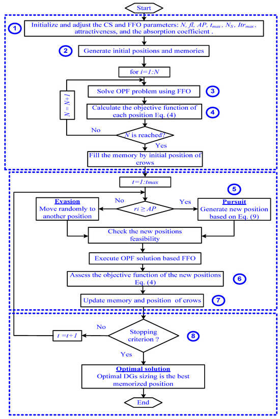 Step 1: The initialization of the CS and FFA parameters, along with the definition of the IEEE 30-bus power distribution system data utilized in this study. The CS parameters encompass flock size (N), flight length (fl), awareness probability (AP), and iteration number (tmax), whereas the FFA parameters include attractiveness () and the absorption coefficient .