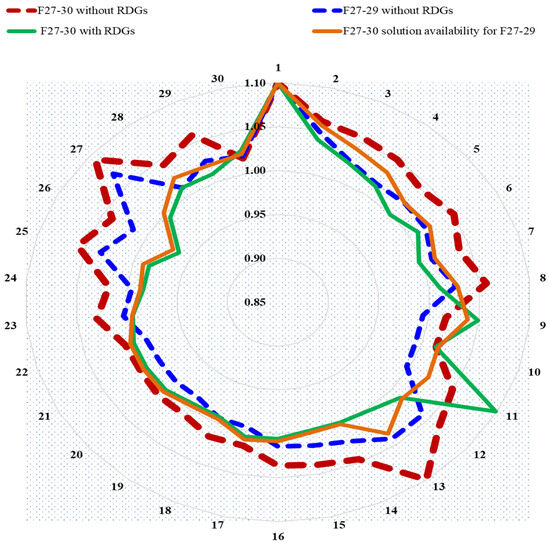 The voltage profile for the IEEE 30-bus power system benchmark under F27-29 and F27-30 with/without RDGs.