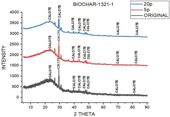 The phases present in the crystalline structure of the biochar samples were investigated using X-ray diffraction (XRD). The analysis was carried out using a Rigaku powder diffractometer, equipped with two horizontal powder diffractometers providing K Cu wavelength radiation (1.54056 Å), operated by a high-power 18 kW rotating anode source, and the outcome presented in Figure 4. The biochar samples were dried and grinded to particles passing 75 µm sieves; additionally, XRD scanning was carried out at a position (2θ, Cu-Kα) between 2° and 90°.