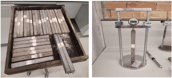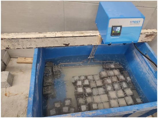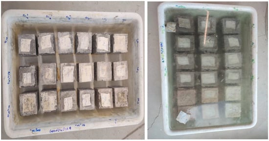 To achieve the desired mechanical and durability properties, the specimens were removed from the mold after 24 h and subjected to appropriate curing conditions for 7 and 28 days. The conditions for drying and ambient curing were maintained at a temperature of 20 °C with a variation of ±2 °C. The sample’s curing process is shown in Figure 6. These conditions included water bath and oven-drying, as well as ambient curing for a specified period ranging from 7 to 28 days.