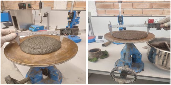 To determine the workability of the fresh mortar mixes, a flow table test was carried out according to the ASTM C1437-15 [30] standard. Figure 7 shows the flow table test. All tests were conducted using the following method.