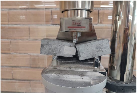 A material’s ability to withstand bending forces applied in a direction perpendicular to its longitudinal axis is known as flexural strength. In compliance with ASTM C348-21 standards [33], the flexural strength of the mortar prism was assessed after 28 days of curing. This was performed by subjecting the prism to a point load using a flexural strength testing machine, as depicted in Figure 9. The prism was positioned atop a roller support with a measured height of 120 mm, and the loading rate was set at 2 kN/s. The flexural strength was determined when the prism reached its failure point.