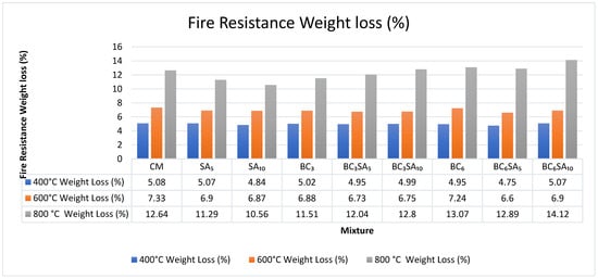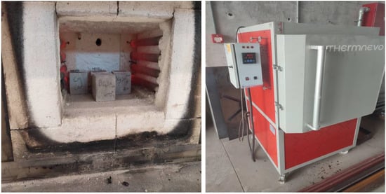 Using an electrical muffle furnace, a fire-resistance test was conducted to assess how well the mixes behaved when exposed to a high-temperature environment in accordance with ASTM E119-20 [37] requirements. The objective temperature range for which the materials were examined was divided into three ranges (400 °C, 600 °C, and 800 °C). Figure 11 shows the electric furnace. The following procedure was used to conduct the test: