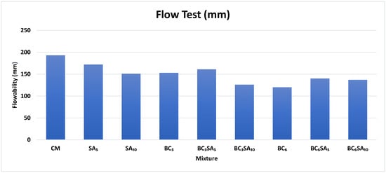 The control mix had the highest flowability compared to all the mixes. The flow rate of SA10 also had the highest flowability compared to SA5, suggesting that increasing the percentage of sludge ash led to a higher flow rate. BC3 exhibited a higher flow rate compared to BC6, and increasing the percentage of biochar resulted in a reduction in flowability. Among the binary blends, BC3SA5 exhibited the highest flow rate compared to the other blends overall, and it was the mix with this blend that exhibited the highest is SA10 except control mix. The decrease in flowability observed in the mixtures, as compared to the control mix, can be attributed to the increased surface area of the materials. This greater surface area led to the absorption of some of the mixing water by the SA and BC, ultimately leading to a reduction in flowability.
