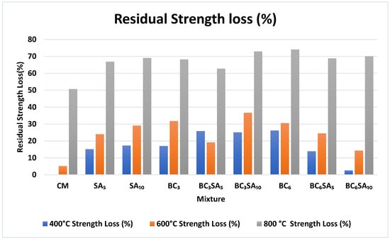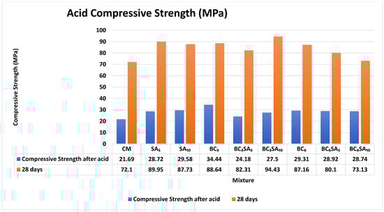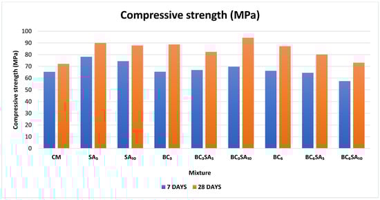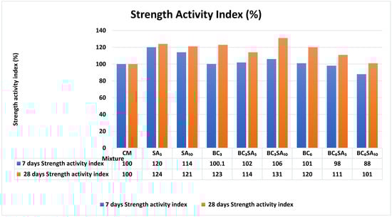 - The strength by compression of mixes comprising SA and BC at various dosages. All combinations had high strength at 28 days in comparison to the baseline mixture, while those constituting 5% and 10% of SA showed increases of 19.52 and 13.78% at 7 days, and 24.76% and 21.68% at 28 days.
