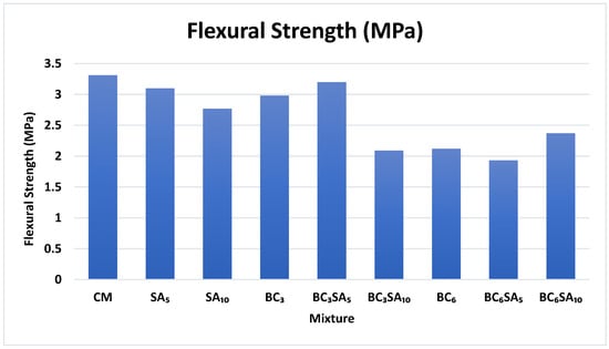 - Among the binary blends, the BC3SA5 mix showed a mere 3% drop in strength, while the BC3SA10, BC6SA5, and BC6SA10 mixes showed more substantial declines of 37%, 42%, and 28%, respectively, when compared to the control mix. BC3SA5 also had better flexural strength than BC3SA10. This can be ascribed to the higher concentration of sludge ash in the mixture (3% biochar, 10% sludge ash), which increased water consumption and resulted in a weaker, more porous structure. Excess water may have increased the porosity of the combination, resulting in lower strength and durability. The BC3SA5 mixture had the highest flexural strength of any blend, with only a 3% loss when compared to the control blend.