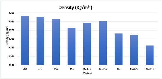 - In a particular volume, the maximum packing density of cement particles is 2252.79 kg/m3. Cement pastes containing 5%, 10%, and 6% BC with 10% SA showed a strong resemblance to the control mix. The filler effect of the SA particles, which has the capacity to raise the overall density of the mixtures, was responsible for this proximity.
